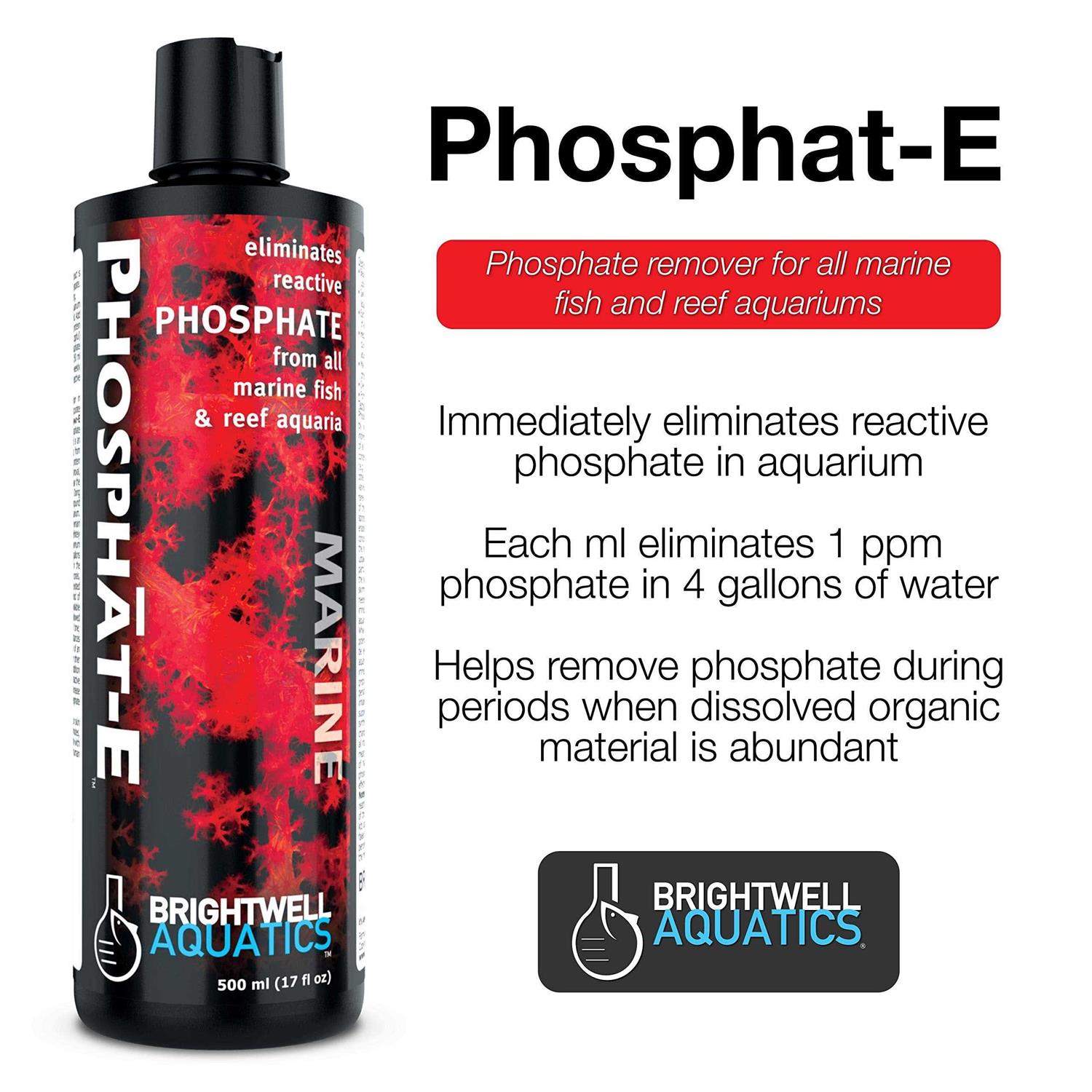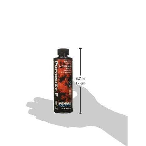 Brightwell Aquatics – PHOSPHAT-E Begins to eliminate reactive phosphate immediatelyupon addition to aquarium. Safe for all inhabitants of reef and marine fish-onlyaquaria. Each ml eliminates 1 ppm phosphate in 4 US-gallonsof water (250 ml treats 1,000 US-gallons). Helps facilitate the removal of phosphate from aquariaduring periods when dissolved organic material isabundant. May be used on an ongoing basis to help controlphosphate in heavily-stocked aquaria. Over 50 stronger than most competing products. Formulated by a marine scientist.