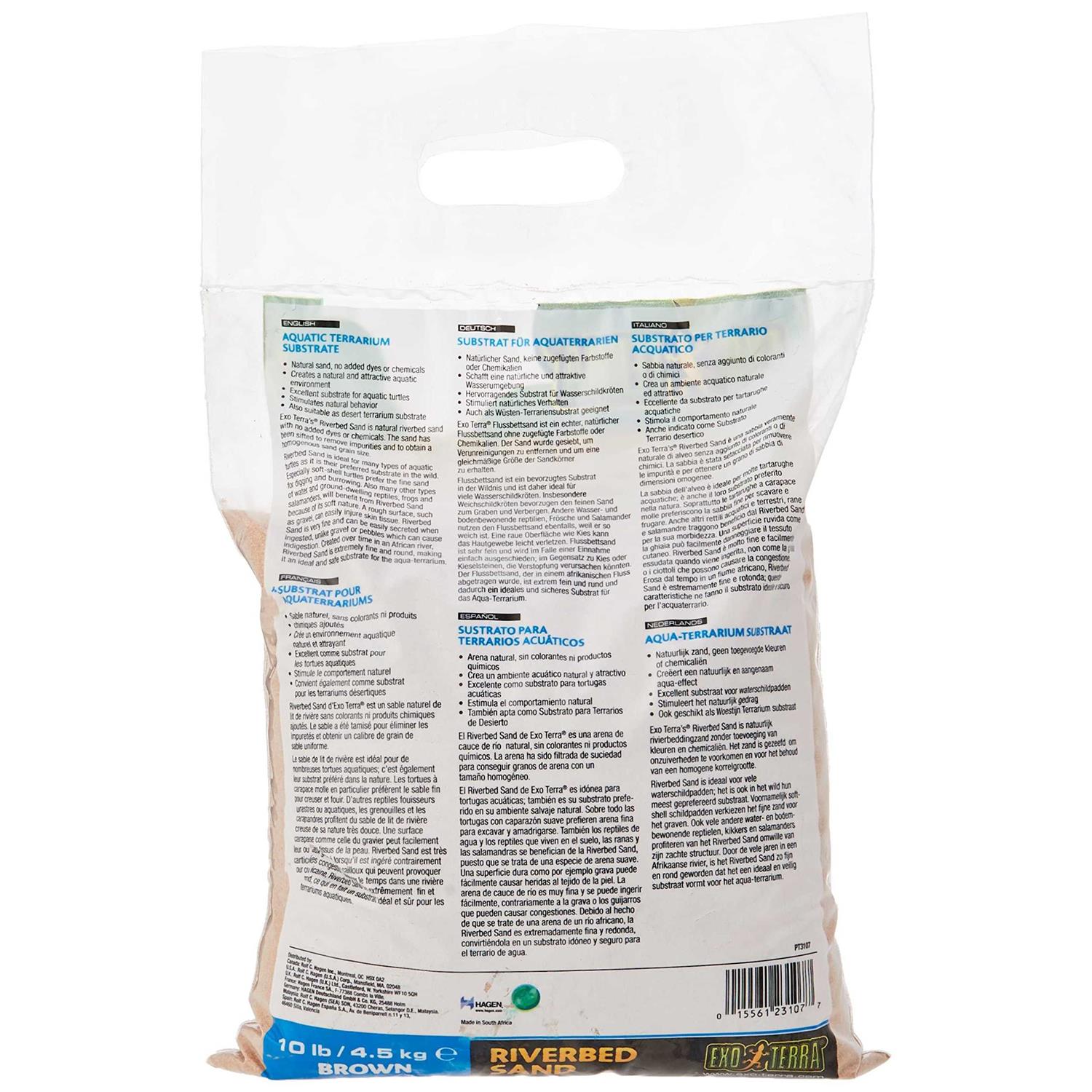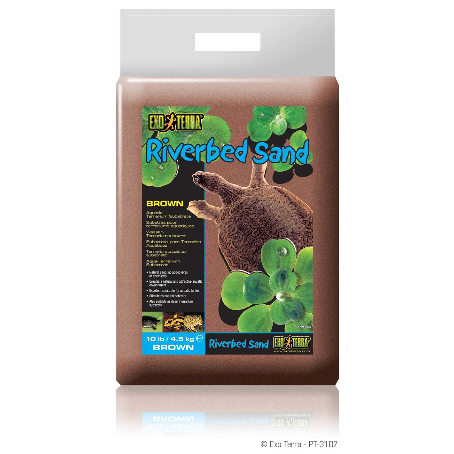Exo Terra riverbed sand is ideal for many types of aquatic turtles as it is their preferred substrate in the wild. Soft-shell turtles especially prefer the find sand for digging and burrowing. Other types of water and ground-dwelling reptiles, such as frogs and salamanders, will also benefit from riverbed sand because of its soft nature. A rough surface, such as gravel, can easily injure skin tissue. Riverbed sand is very fine and can be easily secreted when ingested, unlike gravel or pebbles which can cause indigestion. Created over time in an African river, riverbed sand is extremely fine and round, making it an ideal and safe substrate for the aqua-terrarium. Natural sand, no added dyes or chemicals. Creates a natural and attractive aquatic environment. Stimulates natural behavior. Available in brown color. Available in 10-pound plastic bag.