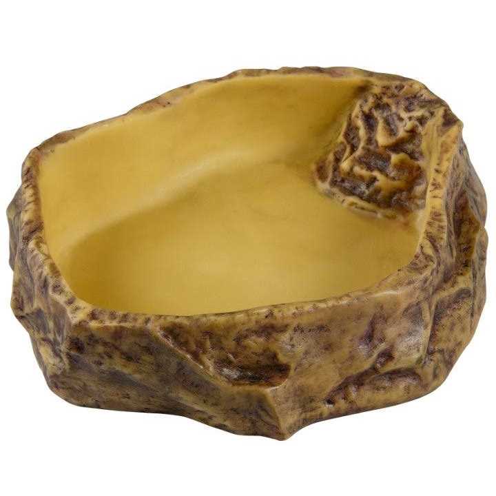 Natural looking water bowl The Exo Terra Water Dish is not only ideal as a water source but also a wonderful visual addition to terrariums. The water dish is made of food-grade resin and is carefully made to resemble natural rock. The outer surface is irregular and resembles natural rock while the inner surface is smooth and non-pitted. The special coating makes the bowl non-porous and prevents the growth of harmful bacteria. It also makes cleaning the water dish really easy. The water dish comes with “safety steps” on the inside to facilitate climbing out and prevent smaller reptiles, amphibians or insects such as crickets from drowning. It is extremely robust and sturdy, making it almost impossible for heavier animals to tip it over.