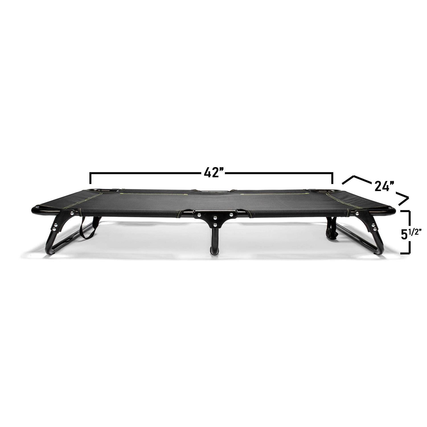 LIGHTWEIGHT & DURABLE steel tube frame with reinforced mesh fabric supports up to 150lbs. NO ASSEMBLY REQUIRED Simple take out of the bag, unfold and let your pet enjoy. LOW PROFILE 5-1/2″ height makes it easier for pets of all ages to climb on and off. NON-SLIP FEET prevent the bed from sliding or scratching your floors. INDOOR/OUTDOOR friendly with a waterproof design and included travel bag. Specifications 42 inch extra wide width for maximum dog stretches 24 inch length for all pup sizes 5-1/2 inch height for any age or breed 150lb weight capacity