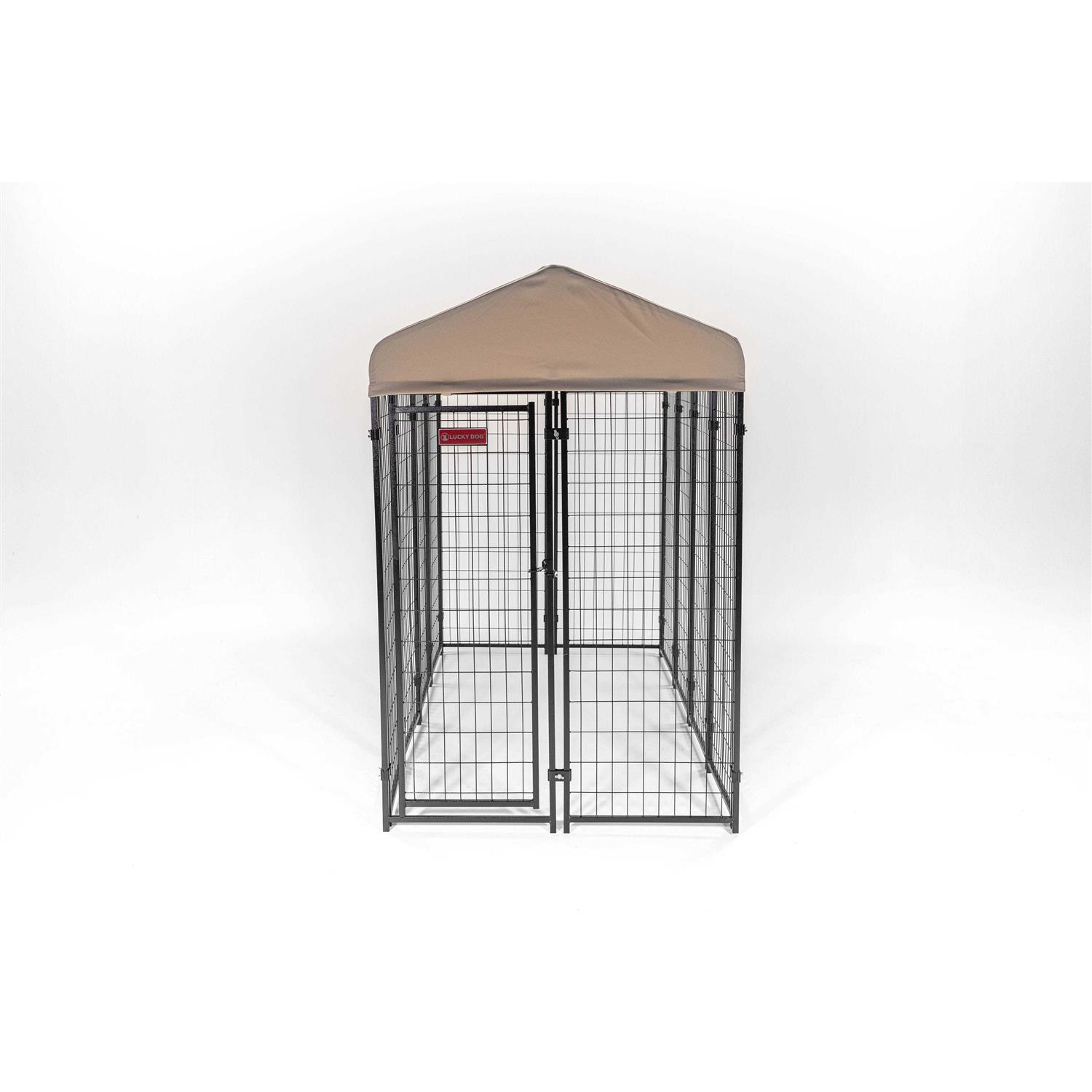 Give your dog the very best. With sleek style and durable design, the Lucky Dog STAY Series Kennel is built with a long-lasting frame and premium roof cover. An all-steel frame features a powder-coat finish that delivers a strong and protected setting for your animal. The waterproof polyester cover offers UPF 50-plus protection and is designed for ultimate comfort. Featuring a premium style that will compliment any yard, the cover includes hidden hook and loop attachments. Easily keep your pup’s home clean by simply removing the roof cover and by wiping off any dirt or debris. This villa dog kennel features a straightforward, no tool assembly so that you have more time to play with your family pet. Measuring 4 x 8 x 6-foot with a door opening of 18.5 x 52.5 inches this kennel has ideal space for your dog. Designed to provide your pet with comfort and protection, the Lucky Dog STAY Series Kennel delivers quality and luxury in one.