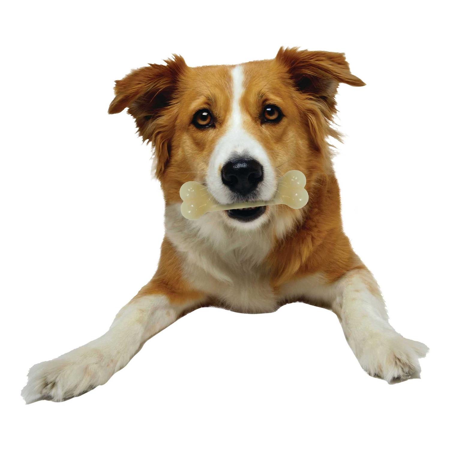 Dog chews with bone-hard texture for the most powerful chewers 3 delicious flavors. Made with super durable nylon. Flavor-enhanced, tough dog chews made from pure nylon. The bone-hard texture of the chew toy wears down slowly for splinter-free plaque and tartar control for improved dental health. Excellent for the determined chewer with a medium to hard bite. Nylabones are flavored with real meat juices, clean easily, and are odor-free. Made in the U.S.A. Flavors: Bacon, original, or chicken. Size: Length Petite 3-3/4″; regular 4-1/2″; wolf 5-1/2″; giant 7-3/4″; souper 8″. Made for small breeds!