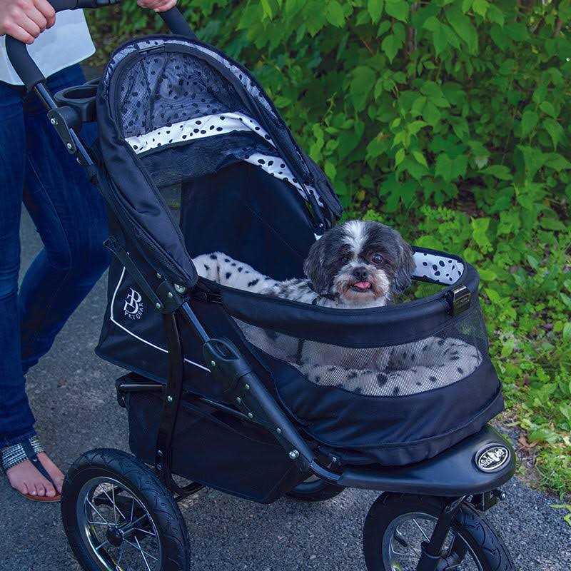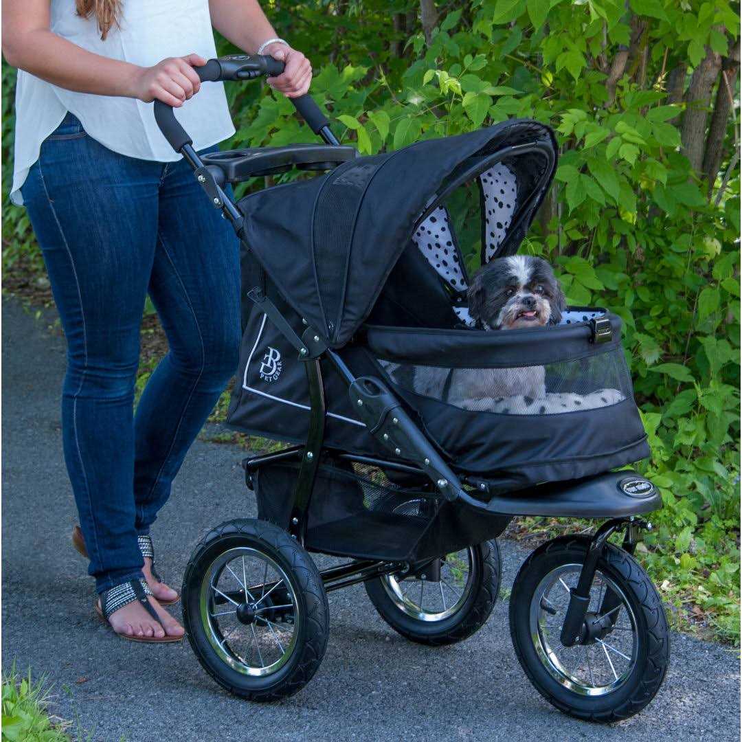 Taking your dog out for a stroll is a breeze with this Pet Gear No Zip Pet Stroller. This smart stroller is stylish, easy to use, and comfortable for your dog. Weather-resistant black nylon features a white and black Dalmatian pattern inside. This stroller features an easy-locking, NO-ZIP design because no zippers means no hassle when trying to open and close the stroller. Comfort features include an elevated paw rest, panoramic view window, weather cover, and plush bolster pad. This stroller is sized to fit dogs as small as 11 pounds up to medium sized dogs that 50 pounds. Your dog will be happy going with you, and you’ll like the handy features of this pet stroller. It needs only one hand to fold up, sports a generous storage basket below, and includes a tray for keys, water bottle, and more. Large 12-inch quick-release air tires with pump roll smoothly. Safety points include an interior tether, locking front wheel, rear safety brakes, and front shock absorbers.