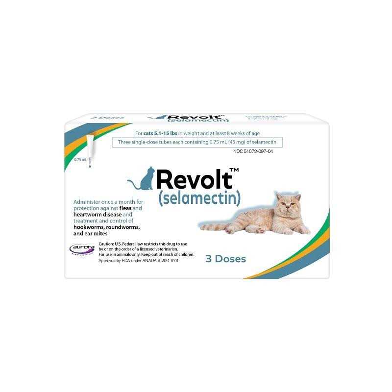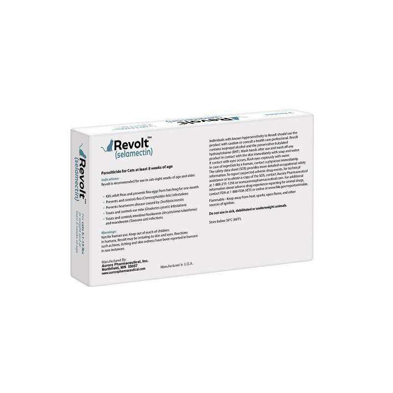 What is Revolt for Cats? Revolt is a prescription, topical medication that prevents heartworm and parasite infections for cats and kittens. – Revolt contains selamectin, a parasiticide that protects cats and kittens against heartworm, fleas, ear mites, and intestinal worms for one month. – Why is Revolt used for Cats? Revolt kills adult fleas, flea eggs and prevents and controls infestations of fleas. Revolt prevents heartworm disease. – It treats and controls ear mite infections. – It treats and controls roundworms and intestinal hookworm infections. What else should I know about Revolt? Revolt is recommended for use in cats weighing at least 5 lbs and eight weeks of age and older. – In humans, Revolt may be irritating to the skin and eyes. – Wash hands after use and wash off any product in contact with the skin immediately with soap and water. Bathing or shampooing the cat 2 hours after treatment will not reduce the effectiveness of Revolt against fleas. Bathing or shampooing the cat 24 hours after treatment will not reduce the effectiveness of Revolt against heartworm. – The American Heartworm Society and most veterinarians recommend an annual heartworm test before prescribing a heartworm preventative for your dog or cat. Dogs and cats with existing heartworm infections can have serious reactions after taking this. – Revolt is sold as a prescription drug in a maximum of a 12-month supply per cat. – What problems could my cat have with Revolt? Consult with your veterinarian before using this product and follow their specific recommendations for use. – Due to alcohol content, do not apply to broken skin. – Do not apply when the haircoat is wet. – Stiff hair, clumping of hair, hair discoloration, or a slight powdery residue may be observed at the treatment site in some animals. These effects are temporary and do not affect the safety or effectiveness of the product. How do you use Revolt? Apply to the skin once a month as directed by your veterinarian. – What is in Revolt? Revolt contains selamectin, a type of parasiticide medication that is effective against heartworm, hookworm, roundworm, fleas, and ear mites. Will I get what I see in the picture? Revolt is a brand name. You will receive the exact brand that you request. content and format 3/10/22 HW