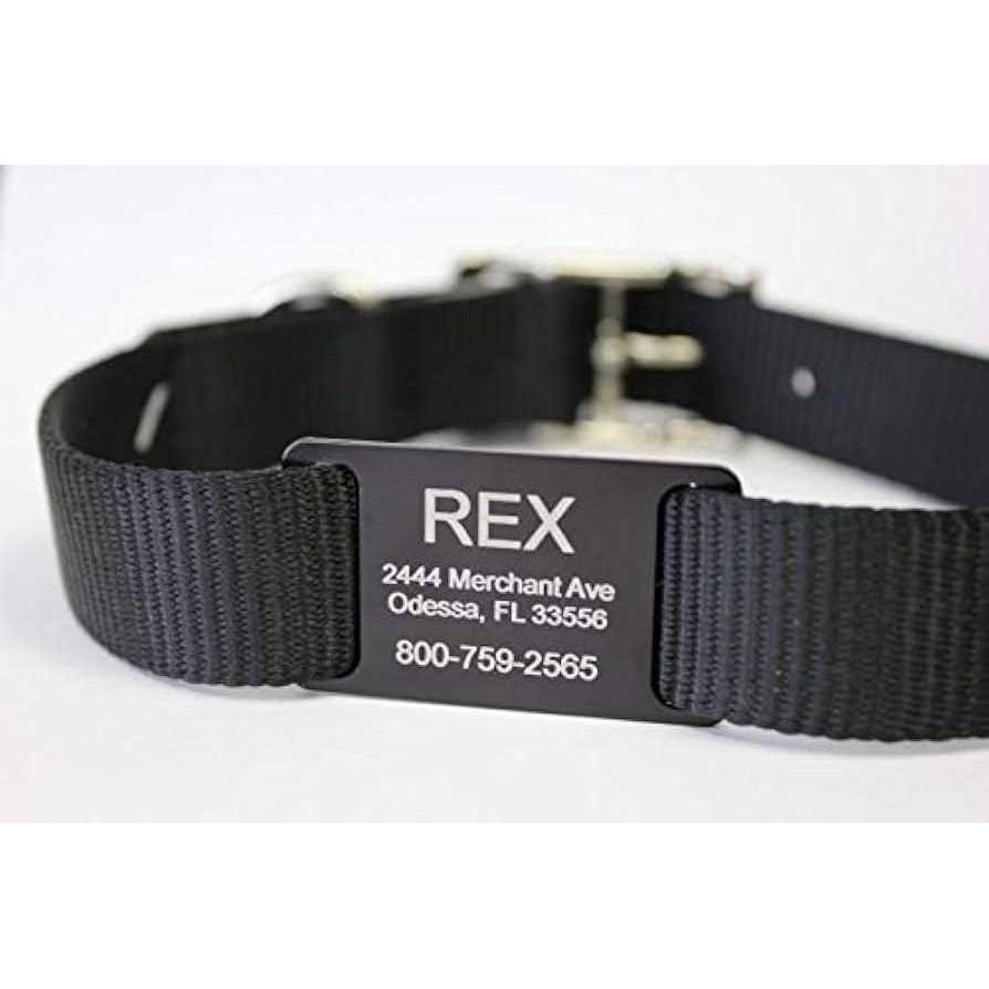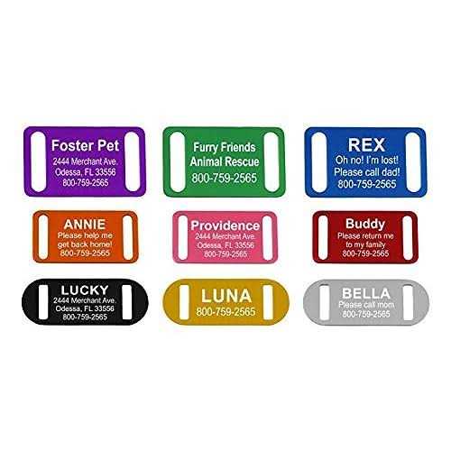 ID Tags by Providence Engraving. Details:Never lose a pet tag again! Providence Engraving’s side-on pet ID tags fit directly over your pet’s belt buckle style collar. Their snug fit ensures that they won’t snag on a fence or branch making these tags much less susceptible to loss than standard pet tags. No tag silencer is required to keep these tags quiet. Since they aren’t suspended from the collar’s d-ring they won’t jingle against other tags or your pet’s food bowls. Please note that these tags are only compatible with belt buckle style closures since one end of the collar must be small enough to slide through the collar slots. Detailed slot dimensions and product dimensions are available in the product images. Providence Engraving’s tags are manufactured and engraved in the USA using aircraft grade aluminum.